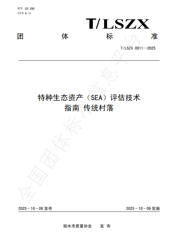 10 月 9 日,由松阳县发展和改革局牵头、中国(丽水)两山学院深度参与起草的《特种生态资产(SEA)评估技术指南 传统村落》团体标准(T/LSZX 0011-2025)正式发布实施。作为全国首个针对传统村落特种生态资产的专项评估标准,该标准的出台标志着我国传统村落生态资产价值评估工作告别 “模糊化” 阶段,迈入 “标准化、规范化、可量化” 的全新发展阶段,为生态产品价值实现提供了“丽水方案”。