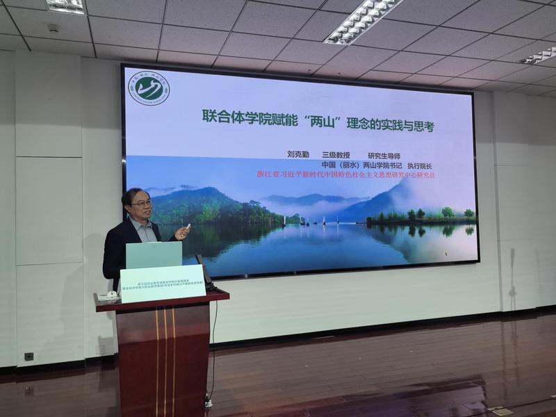 我院书记、执行院长刘克勤应邀参会,以《联合体学院赋能“两山”理念的实践与思考》为题做主题报告,介绍了丽水作为全国首个生态产品价值实现机制试点市,多年来经过锐意探索和改革创新,围绕生态产品价值核算评估和应用体系、生态产品价值实现制度体系,不断创新实践,开辟了多条可示范、可复制、可推广的生态产品价值实现路径,取得了阶段性显著成果和有效经验。同时向与会专家学者介绍了《绿水青山就是金山银山:丽水样本》《绿水青山就是金山银山:试点与理念》等系列丛书,系统总结丽水实践、丽水经验,为全国各地进一步践行“绿水青山就是金山银山”理念提供参考借鉴,为推动形成具有中国特色的生态文明建设模式提供丽水范式。