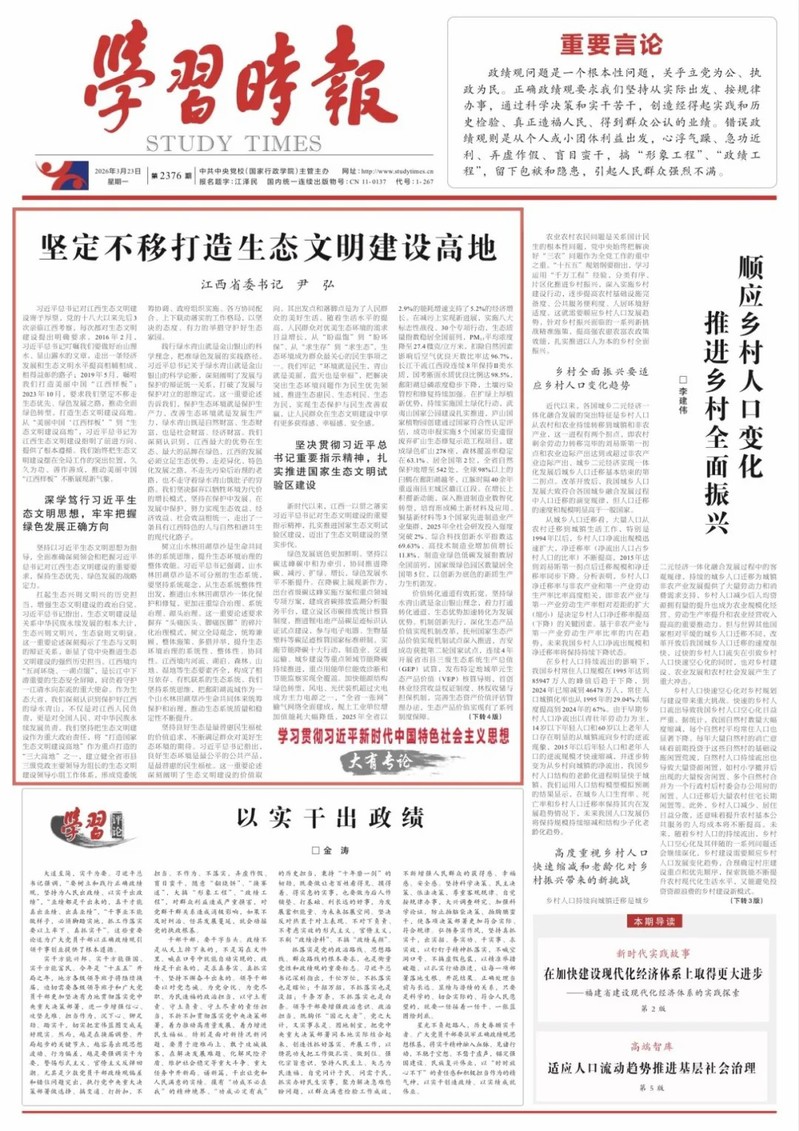 绿色发展底色更加鲜明。坚持以碳达峰碳中和为牵引,协同推进降碳、减污、扩绿、增长,绿色发展水平不断提升。在降碳上展现新作为,出台省级碳达峰实施方案和重点领域专项方案,建成省碳排放监测分析服务平台,建立设区市碳排放统计核算制度,推进锂电池产品碳足迹标识认证试点建设,参与电子电器、生物基塑料等碳足迹核算国家标准研制。实施节能降碳十大行动,制造业、交通运输、城乡建设等重点领域节能降碳持续推进,重点用能单位能效诊断和节能监察实现全覆盖。加快能源结构绿色转型,风电、光伏装机超过火电成为主力电源之一,“全省一张网”输气网络全面建成,规上工业单位增加值能耗大幅降低,2025年全省以2.9%的能耗增速支持了5.2%的经济增长。在减污上实现新进展,实施八大标志性战役、30个专项行动,生态质量指数稳居全国前列,PM2.5平均浓度降至27.4微克/立方米,扣除自然因素影响后空气优良天数比率达96.7%,长江干流江西段连续8年保持Ⅱ类水质,国考断面水质优良比例达98.5%,鄱阳湖总磷浓度稳步下降,土壤污染管控和修复持续加强。在扩绿上厚植新优势,持续实施国土绿化行动,武夷山国家公园建设扎实推进,庐山国家植物园创建通过国家符合性认定评估,成功申报实施5个国家历史遗留废弃矿山生态修复示范工程项目,建成绿色矿山278座,森林覆盖率稳定在63.1%、居全国第2位,全省自然保护地增至542处,全球98%以上的白鹤在鄱阳湖越冬,江豚时隔40余年重返南昌主城区赣江江段。在增长上积蓄新动能,深入推进制造业数智化转型,培育形成稀土新材料及应用、铜基新材料等3个国家先进制造业产业集群,2025年全社会研发投入强度突破2%、综合科技创新水平指数达69.63%、高技术制造业增加值增长11.8%,制造业绿色低碳发展指数居全国前列,国家级绿色园区数量居全国第5位,以创新为底色的新质生产力生机勃发。