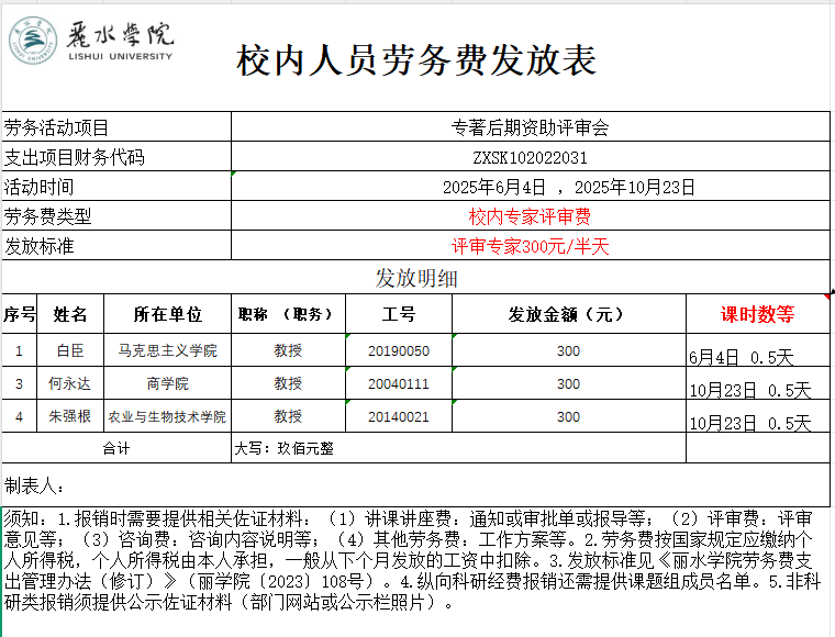 现对2025年6月4日、10月23日中国(丽水)两山学院召开的专著后期资助评审会校内专家评审费发放情况进行公示,具体内容见附件。
